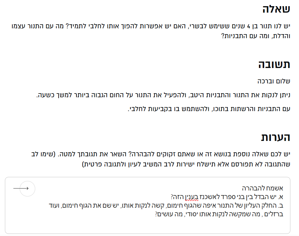 יש לכם שאלה נוספת בנושא זה או שאתם זקוקים להבהרה? השאר את תגובתך למטה. (שימו לב שהתגובה לא תפורסם אלא תישלח ישירות לרב המשיב לעיון ולתגובה פרטית)