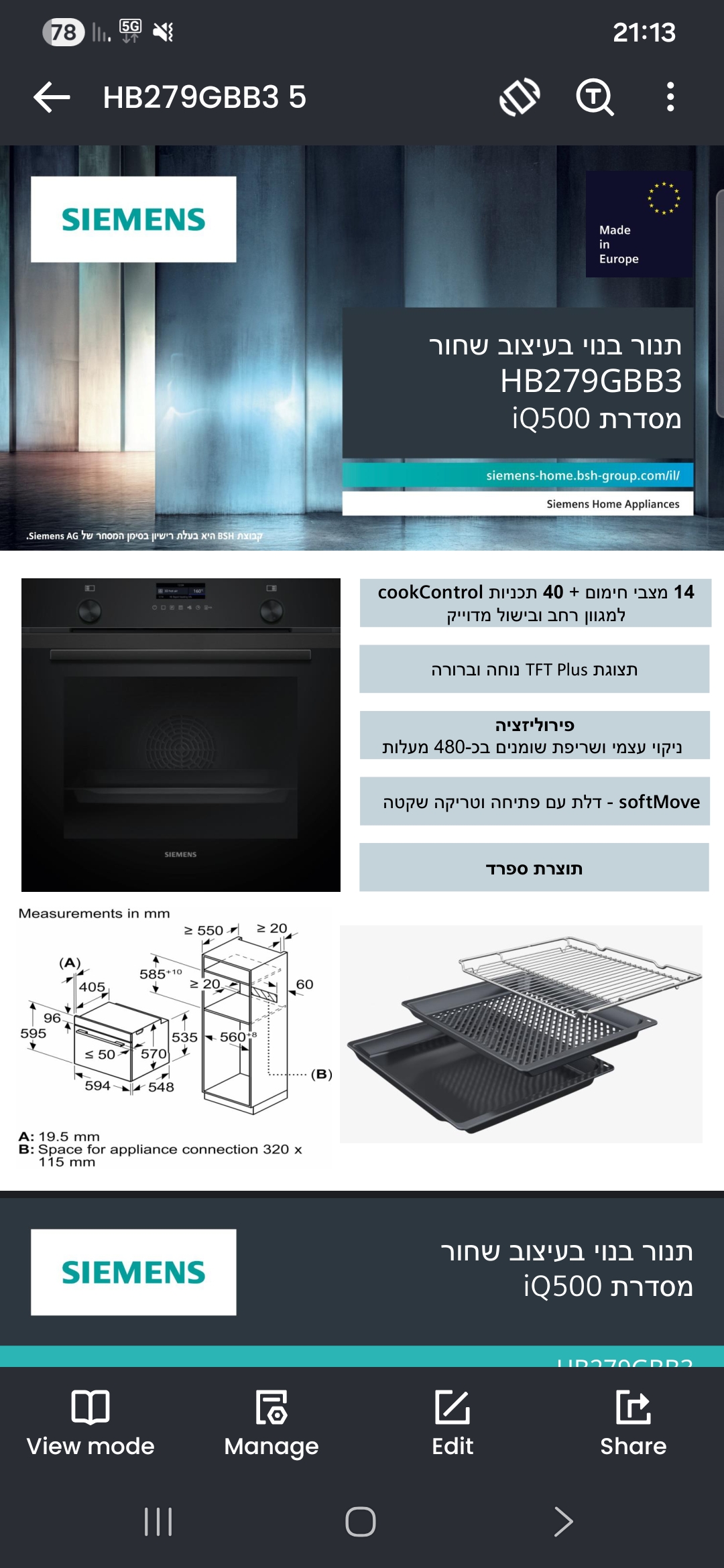 תנור פרולטי סימנס דגם hb279gbb3 מסדרת iq500 האם מאושר להכשרה לפסח?